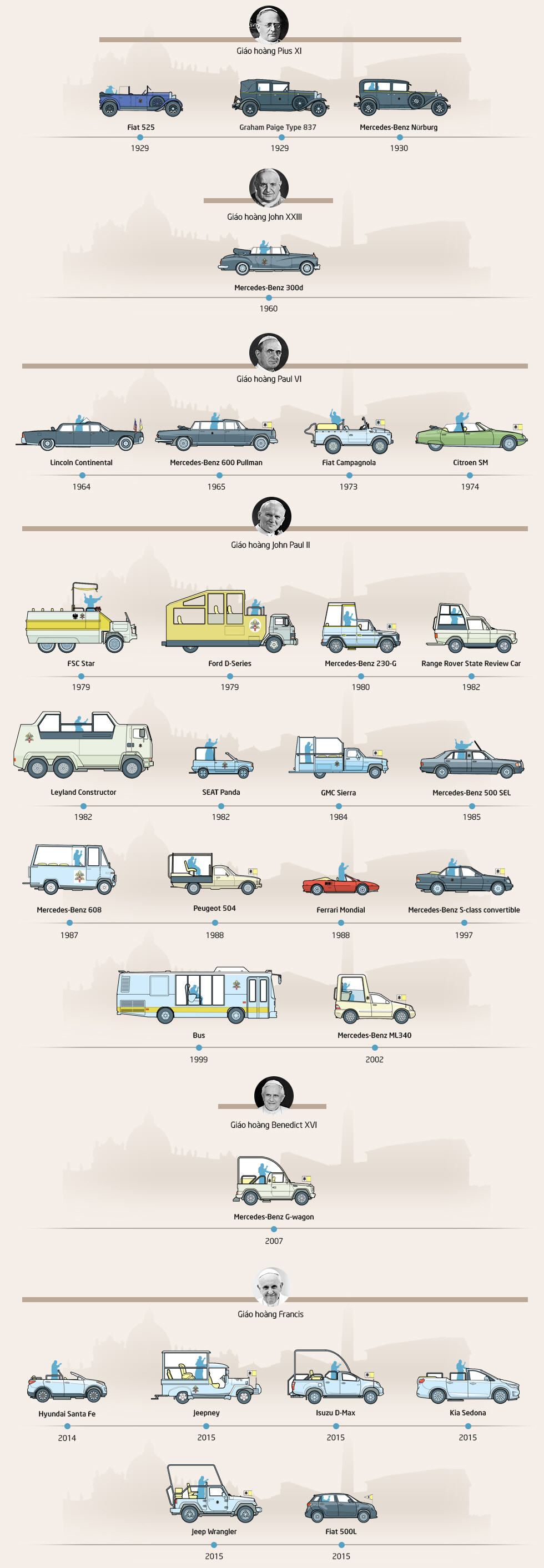 Vietbf.com - Những chiếc xe đặc biệt dành riêng cho các đời Giáo hoàng đã sử dụng qua kể từ năm 1929 khi Giáo hoàng Pius XI lần đầu sử dụng chiếc xe Fiat 525 và lại có hàng chục loại xe khác nhau mà chỉ được chế tạo riêng cho các đời Giáo hoàng mang nhiều thương hiệu khác nhau kể từ năm 1929 cho đến hiện nay, và hãy chiêm ngưỡng hình ảnh xe của các đời dức Giáo hoàng sau đây.