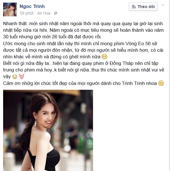 Bao nhiêu người chúc mừng vẫn là chưa đủ với Ngọc Trinh. Bởi vậy mà trên trang cá nhân, Ngọc Trinh đã phải... tự chúc mừng sinh nhật của mình. Nhưng không phải chúc mừng suông, cô cũng khôn khéo "khoe" thành công của bản thân cũng như dự án phim Vòng eo 56 đang thực hiện.
