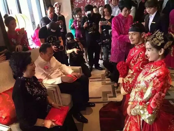 Bố mẹ Huỳnh Hiểu Minh trao hồng bao cho cặp tân lang tân nương.