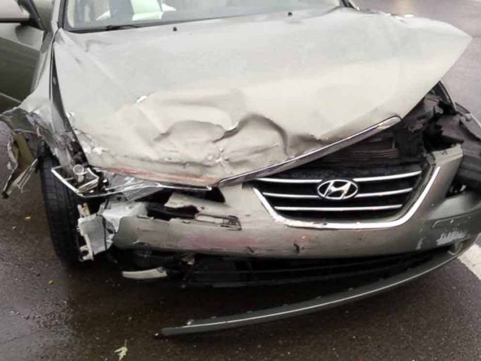 Chiếc xe hơi bị móp đầu sau va chạm.