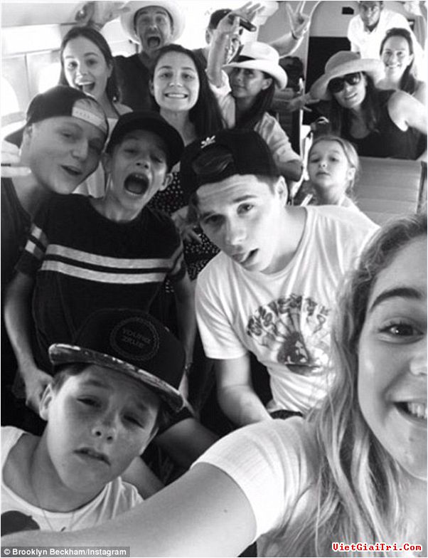 Trên trang cá nhân của mình, cậu cả nhà Beckham – Brooklyn, 16 tuổi mới đây đã bất ngờ chia sẻ hình ảnh đông vui của 2 gia đình trên 1 chiếc thủy phi cơ trên đường trở về London. Bức ảnh selfie đã ghi lại được đầy đủ những gương mặt vui tươi của các thành viên nhà Beckham và Ramsays. Mặc dù là người lớn tuổi trong đoàn nhưng David cũng tạo dáng chụp ảnh rất nhí nhố, trẻ con khi ngồi gần vợ. Trong lúc này, Victoria đội mũ trắng vẫy tay với khuôn mặt rất rạng rỡ. Harper ngồi gần đấy cũng quay mặt lên để cho khuôn mặt mình được lọt vào camera.