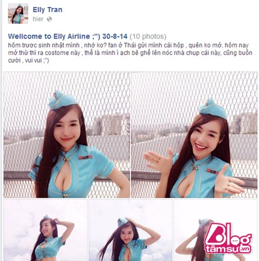 Quà tặng của fan Thái là một bộ đồng phục tiếp viên hàng không màu xanh dương. Tuy nhiên, bộ cánh được thiết kế cách điệu và có đôi phần gợi cảm để khoe ra được lợi thế cơ thể là vòng 1 căng đầy nóng bỏng và vòng eo con kiến của mình. Những hình ảnh của Elly Trần diện bộ đồng phục này khiến không ít người phải xuýt xoa khen ngợi.