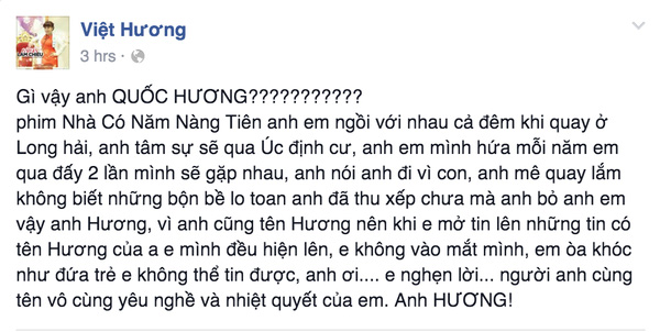 Việt Hương có thời gian đồng hành cùng Quốc Hương khi tham gia phim "Nhà có năm nàng tiên". Cô không tin trước sự ra đi đột ngột này và òa khóc như một đứa trẻ khi đọc tin tức.