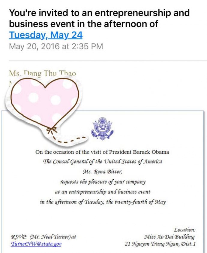 Thư mời Hoa hậu Đặng Thu Thảo tới dự sự kiện có sự tham dự của Tổng thống Obama