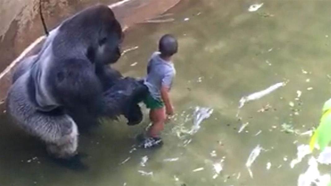 Các nhân chứng có mặt tại sở thú vào thời điểm xảy ra vụ việc cho biết cậu bé 3 tuổi liên tục bày tỏ sự háo hức được vào chơi trong khu vực có con khỉ đột. Một lúc sau, cậu trèo qua rào chắn và rơi xuống con hào nơi Harambe đang ở. Con khỉ đột ngay lập tức lao tới chộp lấy cậu bé và kéo lê trong vòng 10 phút trước khi bị bắn chết.