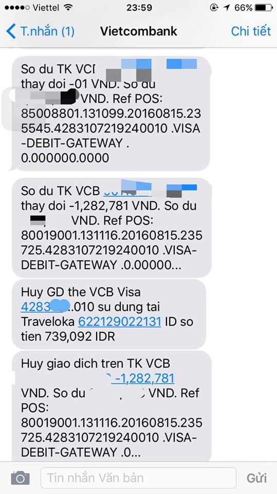 Sms (tin nhắn điện thoại) tiếp theo ḿnh thấy trừ đi 739.092 IDR (tiền Indo), tương ứng với 1.282.781 VND với lư do là được sử dụng tại Traveloka mặc dù ḿnh ko hề sờ đến thanh toán 1 cái ǵ qua mạng luôn ấy. Chưa kịp hoảng hồn th́ lại thấy refund (trả lại) ngay vào tài khoản ḿnh số tiền vừa bị lấy đi (cũng không rơ nguyên do).