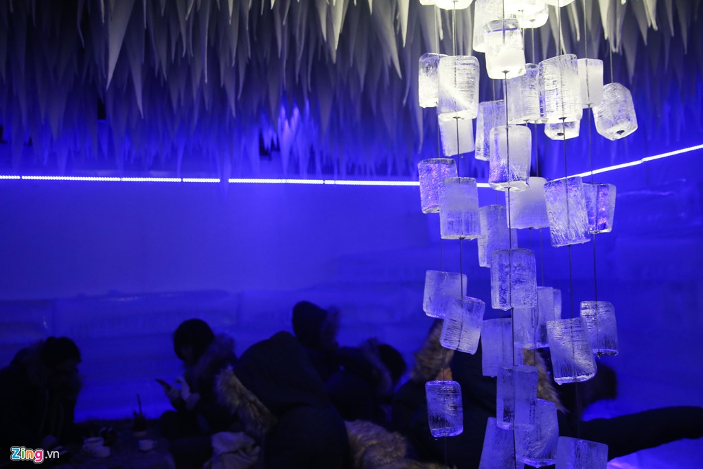 Bên trong quán cà phê băng giá có thiết kế nhiều mô hình bằng băng tạo nên không gian khá đẹp.