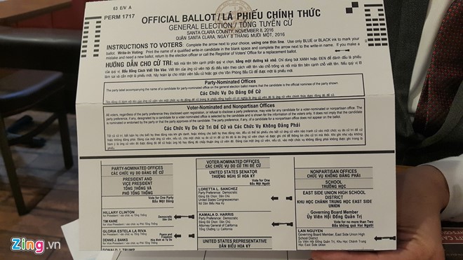 Lá phiếu có in song ngữ tiếng Anh và tiếng Việt của một cử tri gốc Việt bầu chọn bà Hillary Clinton.