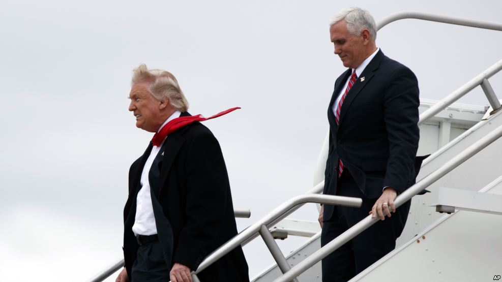 Tổng thống đắc cử Donald Trump (trái) và Phó Tổng thống đắc cử Mike Pence tại sân bay quốc tế Indianapolis, ngày 1/12/2016.
