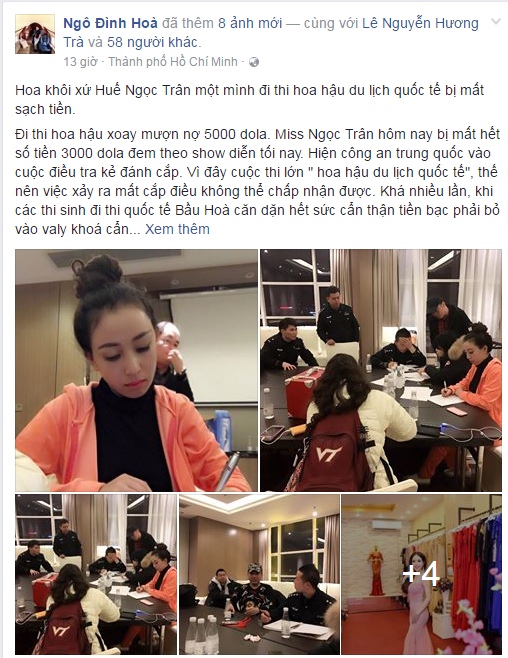 chia sẻ của ông Ngô Đình Hòa, quản lý của Hoài Trân cho biết, cô bị mất tiền ngay tại hậu trường một buổi biểu diễn nằm trong khuôn khổ cuộc thi. Hiện tại, người đẹp cùng Ban tổ chức và cảnh sát đang có buổi làm việc để tìm ra thủ phạm.