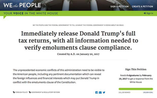 Chưa đầy hai ngày sau khi nhậm chức, một đơn kiến nghị kêu gọi ông Trump công khai hồ sơ thuế đã đạt gần 200.000 chữ ký.