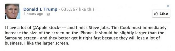 Một lần khác ông Trump lại dọa bán hết cổ phiếu Apple nếu hãng này không chịu ra điện thoại màn hình lớn. Không lâu sau ông nói đã bán hết cổ phiếu APPLE !!!