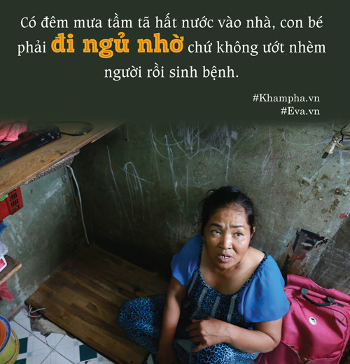 “2 năm trước, khu vực chợ Gà có vụ cháy lớn. Người ta đem vứt bỏ mấy thanh sắt. D́ đă lấy về làm cầu thang leo lên nhà thay cho chiếc gỗ đă mục nát. C̣n mấy tấm vải rách che nhà, d́ lượm lại khâu vá rồi căng lên. Có đêm mưa tầm tă hất nước vào nhà, con bé phải đi ngủ nhờ chứ không ướt nhèm người rồi sinh bệnh. C̣n thời tiết nắng nóng như giờ, mẹ con d́ cố gắng chịu đựng”, bà Vân nói.