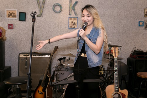 Cô nàng khoe khả năng chơi nhạc cụ, vừa đệm đàn vừa hát những ca khúc theo phong cách riêng.