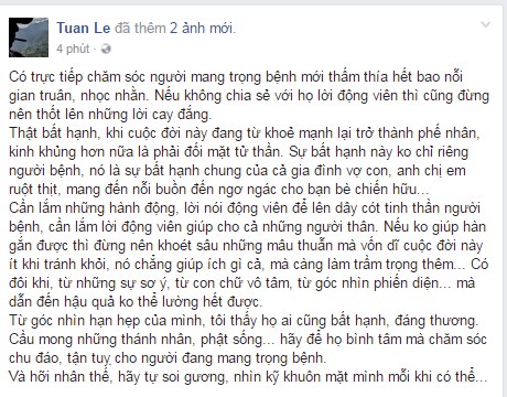 Cần lắm những hành động, lời nói động viên để lên dây cót tinh thần người bệnh, cần lắm lời động viên giúp cho cả những người thân. Nếu không giúp hàn gắn được thì đừng nên khoét sâu những mâu thuẫn mà vốn dĩ cuộc đời này ít khi tránh khỏi, nó chẳng giúp ích gì cả, mà càng làm trầm trọng thêm... Có đôi khi, từ những sự sơ ý, từ con chữ vô tâm, từ góc nhìn phiến diện... mà dẫn đến hậu quả không thể lường hết được.