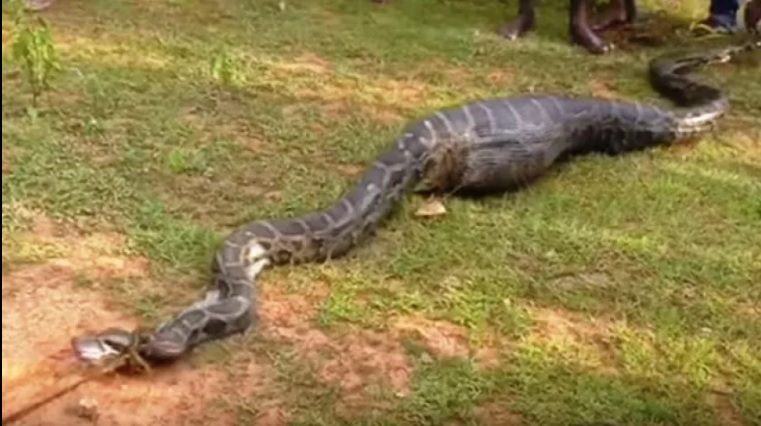 Đoạn video do Carters News Agency đăng tải cho thấy cảnh con trăn dài gần 5 mét nằm bất động vì bị người dân trói gô cổ. Bụng con trăn to lớn bất thường và được xác định nuốt chửng một con dê không lâu trước đó.