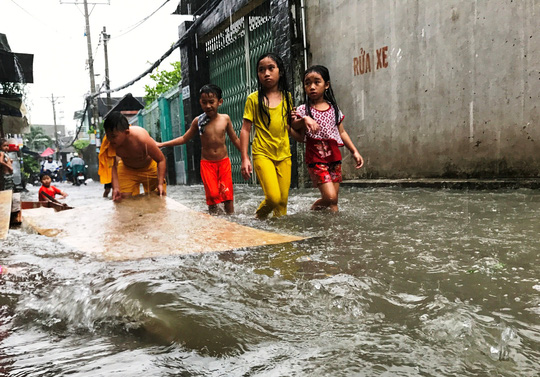 Trẻ em vui đùa trong cơn mưa ở một hẻm nhỏ thuộc phường Hiệp Bình Chánh, quận Thủ Đức