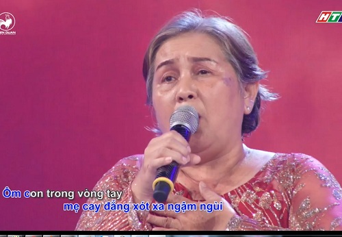 Hình ảnh người mẹ già bước lên sân khấu khiến cho mọi người ngạc nhiên. Và mọi cảm xúc vỡ òa lên khi cô cất tiếng hát ca khúc Gánh hàng rong: “Trên con phố khuya có một người đang bán hàng rong. Cơn mưa vẫn rơi tiếng rao buồn lạc long chơi với. bao năm vẫn ngược xuôi lòng vui thấy con thơ mỉm cười. Mưa ơi thôi đừng rơi để mẹ về còn chút niềm vui.”