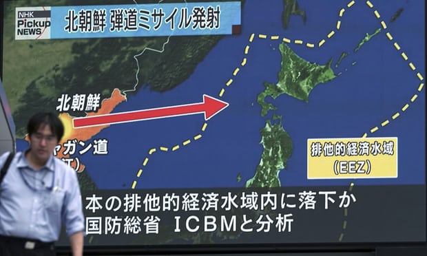 Truyền h́nh Nhật Bản đưa tin về vụ phóng tên lửa mới nhất của Triều Tien (Ảnh: Guardian)