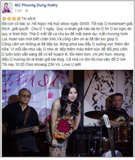 Theo đó, cô đã gửi thông báo đến các khán giả việc Hồ Ngọc Hà hủy show ngày 9/9 tới và tỏ ra vô cùng bức xúc:"Quý vị khán giả nào đã tin Dung thì Dung không bao giờ để quý vị thiệt thòi. Thà Dung mất tất cả chứ không để mất danh dự, mất chương trình. Lúc hoạn nạn mới biết chân tình. Và cũng cảm ơn ai đã tận lực giúp Dung. Cũng cảm ơn những ai đã tiếp tục đứng phía sau đẩy Dung xuống vực thêm lần nữa. Vì mỗi lần như vậy Dung như được tiếp thêm máu thêm sức để đối phó cuộc đời. Dung luôn luôn sẵn sàng để có kế hoạch B, tốn kém hơn, chi phí hơn, nhưng điều Dung hướng tới là khán giả hài lòng".