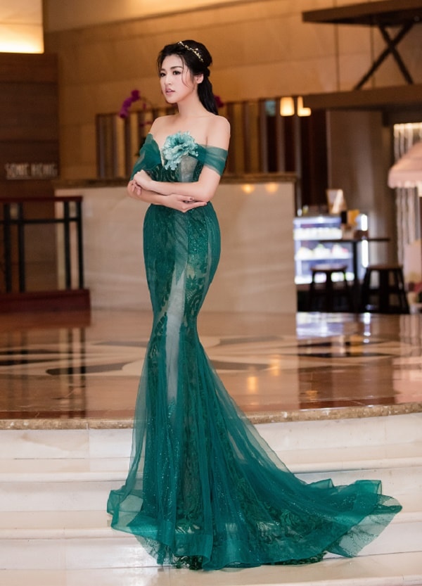 Tại sự kiện, người đẹp diện trang phục lộng lẫy, với màu xanh lục bảo làm chủ đạo kết hợp với chất liệu ren nhập khẩu tinh tế. Cô búi tóc cao, lấy điểm nhấn là chiếc vòng có họa tiết như chiếc vương miện. Cách trang điểm trong suốt, kỹ càng cũng giúp cô khoe được tối đa vẻ đẹp tự nhiên.