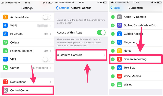 Nếu bạn chưa có biểu tượng này, rất có thể bạn chưa thêm tính năng này vào Trung Tâm Điều Khiển. Hãy vào Settings > Control Center > Customize Controls (Cài đặt > Trung Tâm Điều Khiển > Tuỳ biến) và chọn mục quay màn hình Screen Recording.
