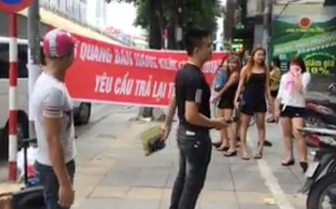 Khi vị khách này mang ra cửa hàng Đăng Quang Watch yêu cầu đổi đồng hồ mới, hãng bắt phải đưa thêm 10 triệu mới đổi được. Quá bức xúc với cách làm trên, anh Tuấn đã dẫn ra một số “chân dài” cầm băng rôn khẩu hiệu, loa đến trước cửa hàng đồng hồ kêu gọi trả lại tiền.
