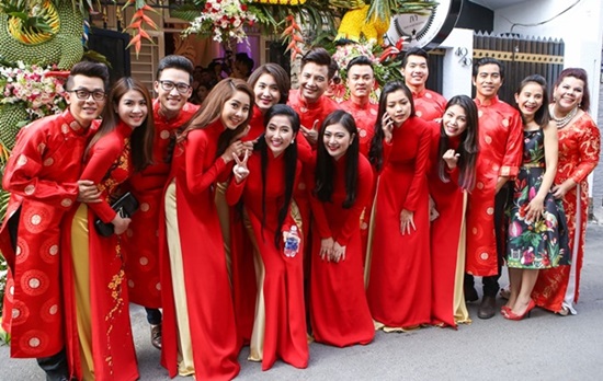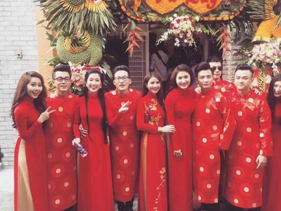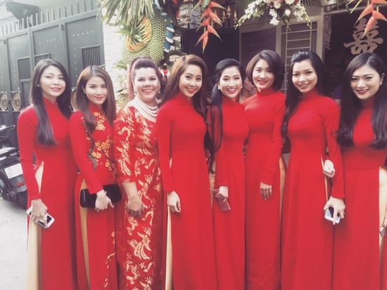 Một người đẹp khác khiến cô dâu phải "dè chừng" là nữ diễn viên Tường Vi. Trong đám cưới của Thúy Diễm và Lương Thế Thành hồi giữa tháng 4/2016, người đẹp Tường Vi (đứng thứ 4 từ trái qua) nổi bật giữa dàn phù dâu diện áo dài đỏ nhờ nụ cười rạng rỡ, thần thái vui tươi và đôi mắt to tròn.
