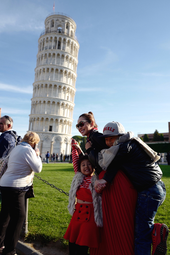 Hai nhóc tỳ thi nhau ôm chầm lấy mẹ khi chụp ảnh kỷ niệm bên tháp nghiêng Pisa.