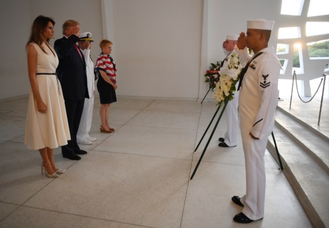 Tại Hawaii, Tổng thống Mỹ Donald Trump và Đệ nhất phu nhân Melania Trump đã ghé thăm Đài tưởng niệm USS Arizona và tham dự cuộc họp với Bộ Tư lệnh Thái Bình Dương của Mỹ, theo ABC News. Ảnh: AFP