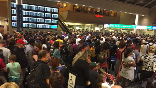 Hành khách đợi nhiều giờ tại sân bay quốc tế Orlando do sự cố pin máy ảnh. Ảnh: Orlando Sentinel.