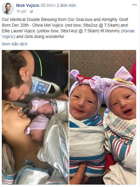 Những tưởng hạnh phúc với cặp đôi như vậy đã trọn vẹn. Vậy nhưng mới đây, những người yêu mến chàng trai không tay không chân một lần nữa phải ngỡ ngàng khi Nick bất ngờ thông báo trên trang cá nhân việc anh tiếp tục làm bố của hai cô công chúa nhỏ. Tức là người vợ xinh đẹp của Nick đã lần thứ 3 mang thai và thậm chí còn là mang thai đôi.