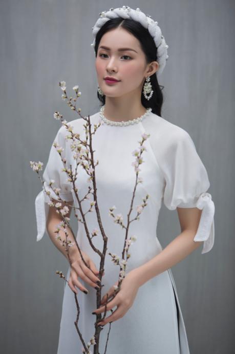 Vẻ đẹp mong manh của Hạ Vi càng khiến bộ áo dài trở nên cuốn hút hơn bao giờ hết.