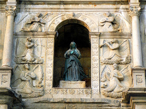 Phần mặt tiền c̣n sót lại của nhà thờ gồm bốn tầng kiến trúc, là một tác phẩm điêu khắc đồ sộ với những bức tượng Chúa, thiên thần và ác quỷ, h́nh rồng Trung Quốc, hoa cúc Nhật Bản và tàu thuyền Bồ Đào Nha.