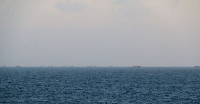 Các tàu cá Trung Quốc nối đuôi nhau qua đảo Sinh Tồn Đông, ngược lên bãi Ba Đầu. (Hình: Thanh Niên)