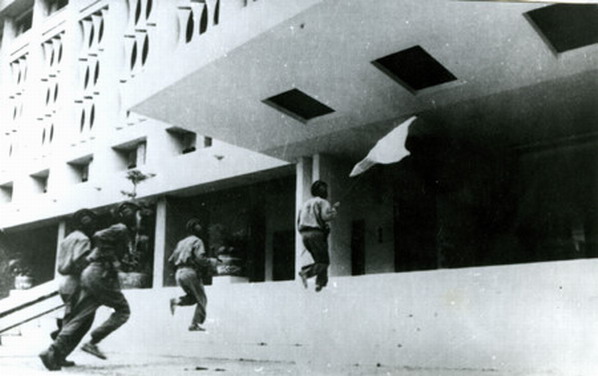 Hai lần như vậy, ông Thận ra lệnh quay nòng pháo ra sau để cho xe húc đổ cổng Dinh, nhưng húc không đổ, xe chết máy, kẹt tại cổng !!!