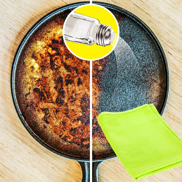 Đổ một cốc muối nhỏ lên bề mặt chảo. Sau đó, chỉ cần lấy một chiếc khăn và đơn giản chà xát những chỗ bám dầu mỡ cho đến khi mặt chảo sạch sẽ. Cuối cùng rửa lại chảo theo các bước thông thường.