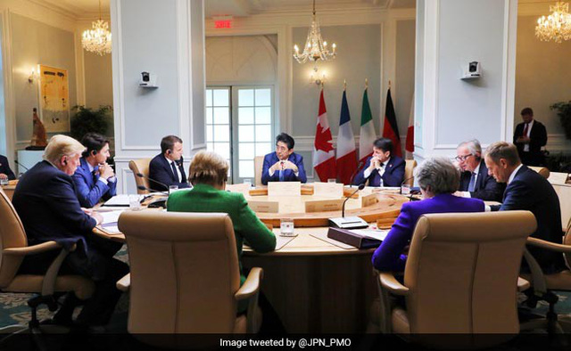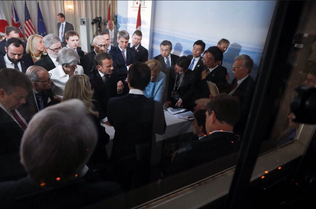 Hội nghị thượng đỉnh của 7 nước công nghiệp G7 đã diễn ra tại Canada trong tuần này với sự tham gia của 7 nhà lãnh đạo. Một khoảnh khắc ấn tượng đã được ghi lại khi Tổng thống Donald Trump ngồi giữa đám đông các quan chức, xung quanh ông là Thủ tướng Đức Angela Merkel, Tổng thống Pháp Emmanuel Macron, Thủ tướng Anh Theresa May, Thủ tướng Nhật Bản Shinzo Abe, Thủ tướng Canada Justin Trudeau và Thủ tướng Italy Giuseppe Conte. Tất cả dường như đang tranh luận về một chủ đề khi trên bàn xuất hiện một số tài liệu.