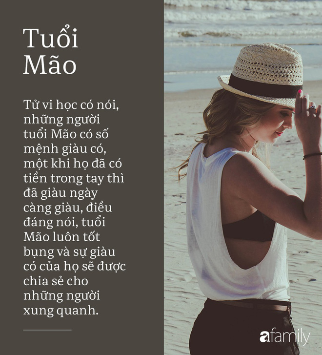Đến khi bước vào tuổi trung niên, tính cách tuyệt vời ấy lại ngấm sâu vào con người của họ giúp họ tạo được một nền tảng vững chắc mà không gì có thể lay chuyển được. Tử vi học có nói, những người tuổi Mão có số mệnh giàu có, một khi họ đã có tiền trong tay thì đã giàu ngày càng giàu, điều đáng nói, tuổi Mão luôn tốt bụng và sự giàu có của họ sẽ được chia sẻ cho những người xung quanh.