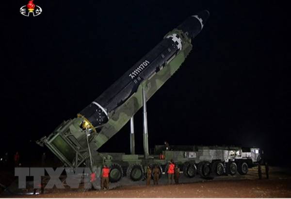 Tên lửa liên lục địa được đặt vào bệ phóng di động ở Triều Tiên, chuẩn bị cho vụ phóng. (Nguồn: YONHAP/TTXVN)