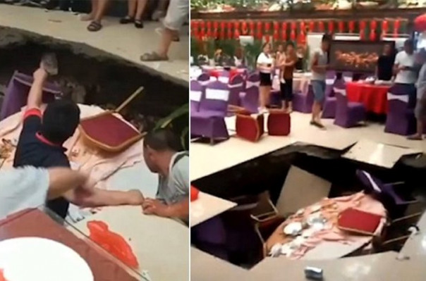 Một hố tử thần bất ngờ xuất hiện tại khu tiệc cưới, nuốt chửng chiếc bàn lớn và 6 khách mời đang ngồi ăn. Đoạn video ghi lại tại hiện trường cho thấy một số nạn nhân được những người khác kéo lên khỏi hố sâu.
