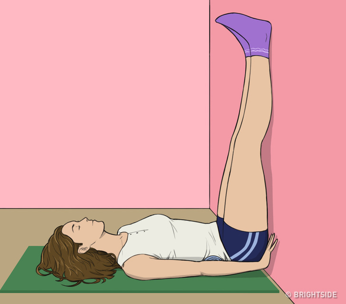 Bạn nằm trên giường hoặc trên đệm tập kê sát cạnh tường, cố gắng để mông áp sát vào tường càng nhiều càng tốt, hướng mặt ra ngoài. Lấy cánh tay làm điểm tựa, gác chân lên tường, điều chỉnh tư thế sao cho cơ thể nằm vuông góc với tường, chân áp chặt vào tường, hai tay để xuôi dọc theo thân, lòng bàn tay hướng lên hoặc xuống dưới đều được. Hít thở ít nhất 10 hơi. Bạn cũng có thể gác chân lên ghế hay đệm dưới lưng một chiếc chăn, một chiếc gối dưới đầu nếu nền nhà cứng.