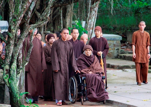 Ngài mặc bộ áo màu nâu sòng quen thuộc, đội mũ len ngồi trên xe lăn được các tăng ni đẩy chậm rãi trong khuôn viên chùa. Thấy thiền sư, nhiều phật tử và người mộ đạo đã rất bất ngờ, chắp tay thành kính đảnh lễ rồi nhập vào đoàn tháp tùng dạo cảnh chùa. Khoảng 30 phút sau, thầy được các tăng ni đưa về an dưỡng.