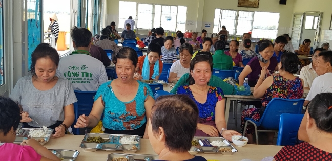 Nhà ăn từ thiện phục vụ 3 bữa ăn mỗi ngày, gồm bữa cháo cho buổi sáng và 2 bữa cơm cho buổi trưa, chiều. Bệnh nhân sau khi ăn xong chỉ cần tự rửa khay thức ăn của ḿnh rồi về giường nghỉ ngơi chờ đến giờ điều trị.