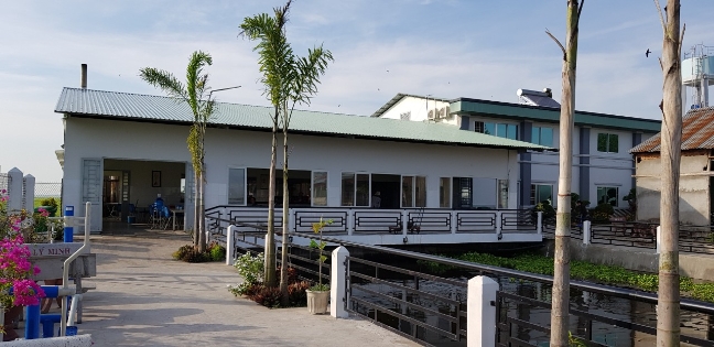 Nhà ăn có không gian thoáng mát nằm cạnh cánh đồng và hồ nuôi cá