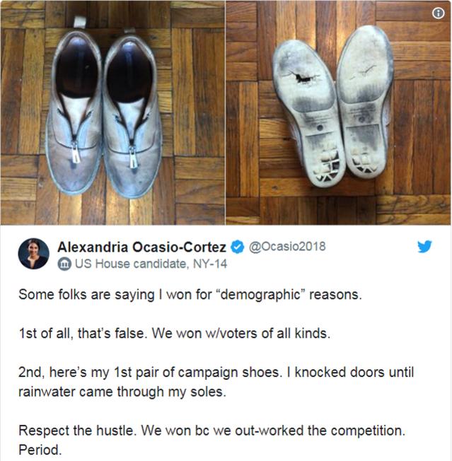 “Đây là đôi giày đầu tiên trong chiến dịch tranh cử của tôi. Tôi đã đi gõ cửa từng nhà cho tới khi nước mưa tràn vào lòng bàn chân. Chúng ta đã chiến thắng vì chúng ta nỗ lực và chăm chỉ. Chấm hết”, Cortez viết sau chiến thắng lịch sử trong cuộc bầu cử sơ bộ trước ứng cử viên từng nắm ghế hạ nghị sĩ 10 nhiệm kỳ Joe Crowley.