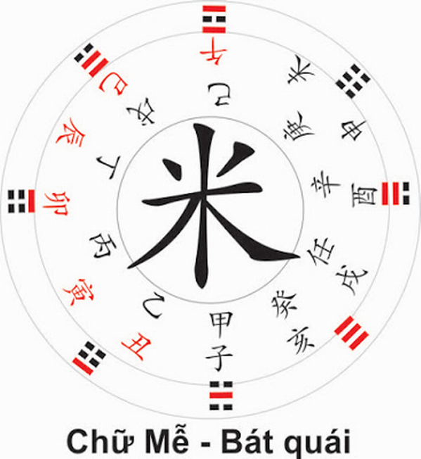 Dân tộc ta suốt mấy chục ngàn năm đi t́m long mạch hay những con sông và băi bồi cốt để trồng lúa, lúa chính là sanh mạng của người Việt ngày ấy, công việc này quan trọng và lâu dài đến nỗi nó trở thành một nền văn hóa gọi là văn hóa lúa nước, con chữ cũng không ngoại lệ, các chữ Mộc木, Ḥa禾, Miêu苖, đều được h́nh thành từ sơ đồ dịch học, ngay cả hai cái tên Hà河và Lạc洛 đều viết với bộ thủy, người ta thường dựa vào truyền thuyết mà nói đó là sông, ḱ thật nó mang đậm h́nh ảnh của người trồng lúa nước, tức người Việt. Chữ Mễ 米 cũng không ngoại lệ. Hạt gạo ngày ấy là kết tinh cả một lịch sử lâu dài, cùng với bao hy sinh mất mát của nhiều thế hệ mới có được hết quả là một bát cơm, v́ vậy mới có câu ca dao: