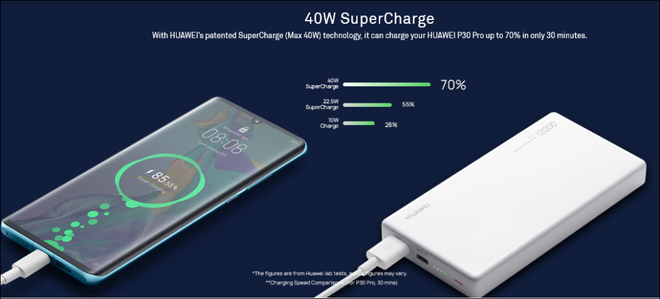 Sạc SuperCharge cung cấp tốc độ sạc siêu nhanh cho các thiết bị mà nó hỗ trợ. Theo Huawei, mẫu sạc dự phòng này có thể sạc 70% pin cho P30 Pro chỉ trong 30 phút. Trong cùng thời gian, một mẫu sạc dự phòng 10W chỉ sạc được 26%. Trong khi đó, sạc dự phòng SuperCharge 22,5W của mà Huawei ra mắt trước đây sạc được 55% trong 30 phút.
