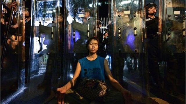Một người biểu tình ngồi thiền trên đường phố đêm qua, phía sau là các cảnh sát được trang bị khiên (Ảnh: AFP)