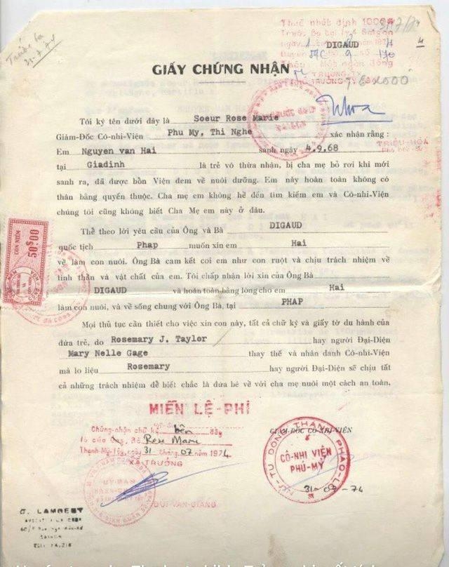 Giấy chứng nhận Nguyễn Văn Hải là trẻ vô thừa nhận, cho ông bà Digaud nhận nuôi - Ảnh: NVCC